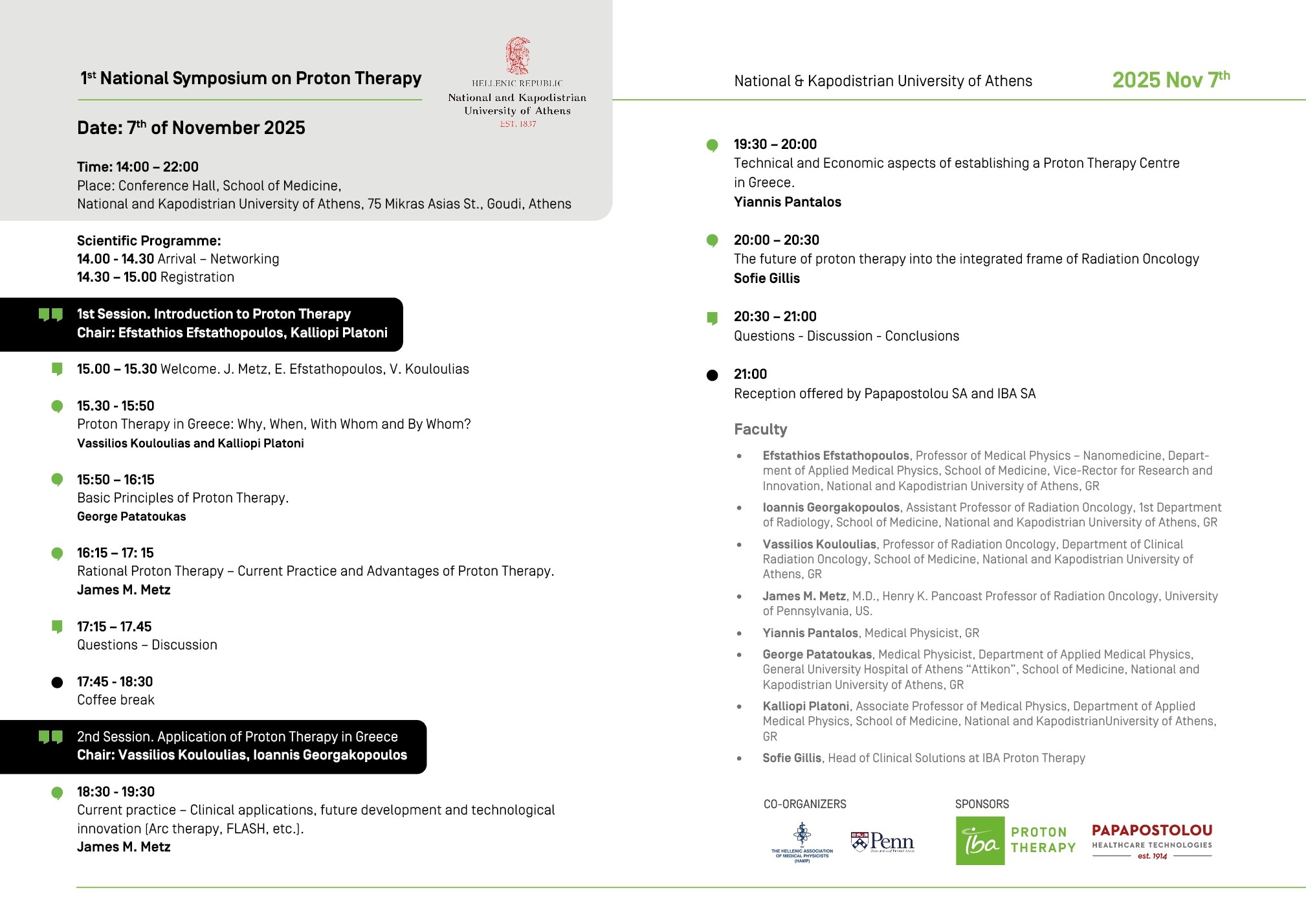Το Εργαστήριο Εφαρμοσμένης Ιατρικής Φυσικής μαζί με το Εργαστήριο Ακτινοθεραπευτικής Ογκολογίας τηε Ιατρικής Σχολής του ΕΚΠΑ και με συνδιοργανωτές την Ένωση Ελλήνων Φυσικών και το University of Pensylvania, το 1ο Εθνικό Συμπόσιο για την Ακτινοθεραπεία με Πρωτόνια στην Ελλάδα.
